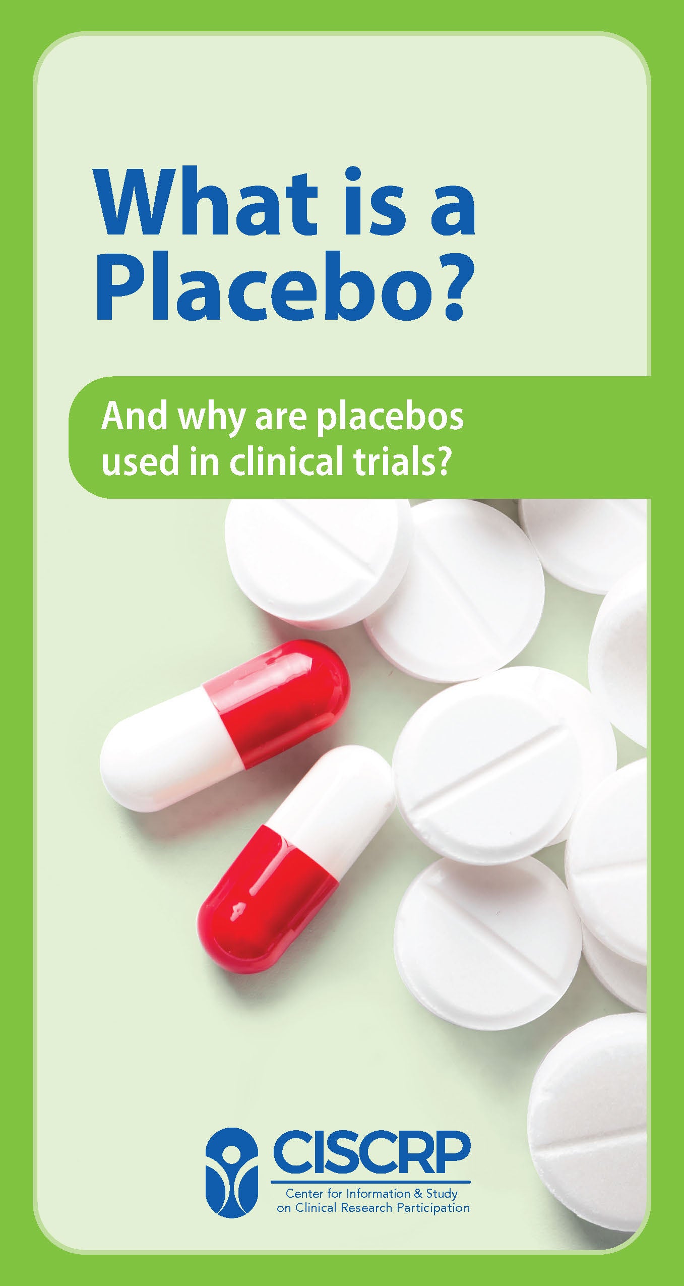 If you or someone you know is considering taking part in a clinical trial, this brochure is for you. It is intended to help you understand what placebos are, and why they are used in clinical trials. We developed this brochure together with subject matter experts, patient advocates, and members of the public, to make sure the topics, language, images, and design are appropriate and engaging.